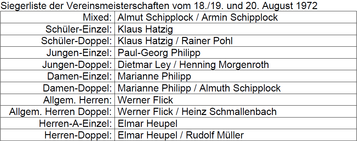 - Marianne Philipp wird in Erndtebrück Kreismeisterin im Damen-B-Einzel und zusammen mit Wilma Becker auch noch im Damen-B-Doppel.