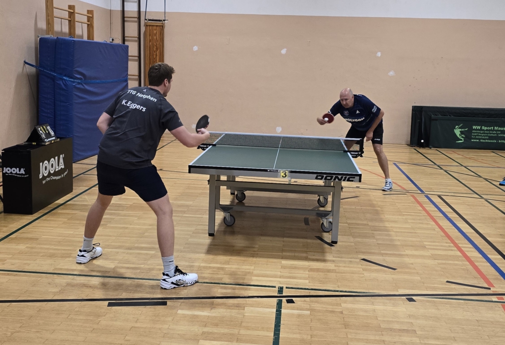 Schippi, Kevin und Matze gewannen die ersten drei Einzel nach den Doppeln alle im fünften Satz. Danach folgten leider zwei Niederlagen von Ferenc (1:3) und Gabriel (0:3). Die erste Runde der Einzelbegegnungen endete mit einem Sieg von Samet – natürlich im fünften Satz! Somit hieß es 6:3 aus unserer Sicht.